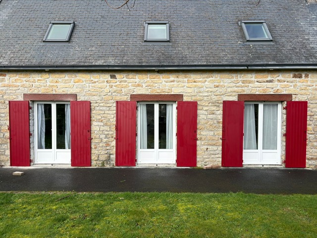 Volet battant avec pré-cadre en aluminium SIB ral 3004 rouge pourpre texturé sur un chalet PONT L’ABBE