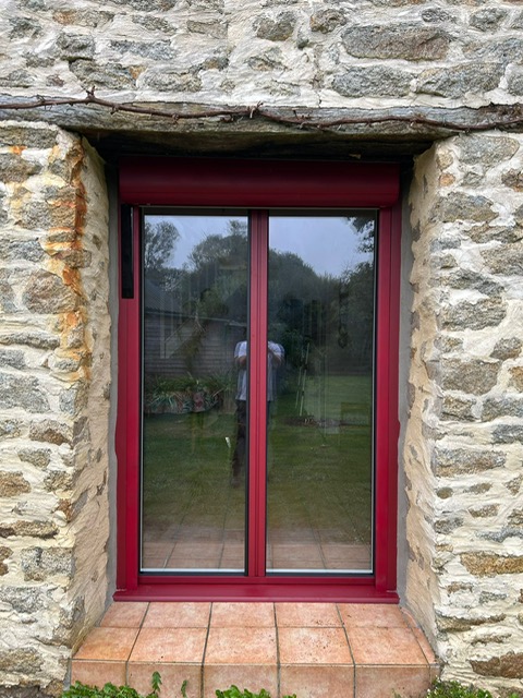 Volet battant avec pré-cadre et serrure en aluminium SIB ral 3004 rouge pourpre texturé sur un chalet PONT L’ABBE